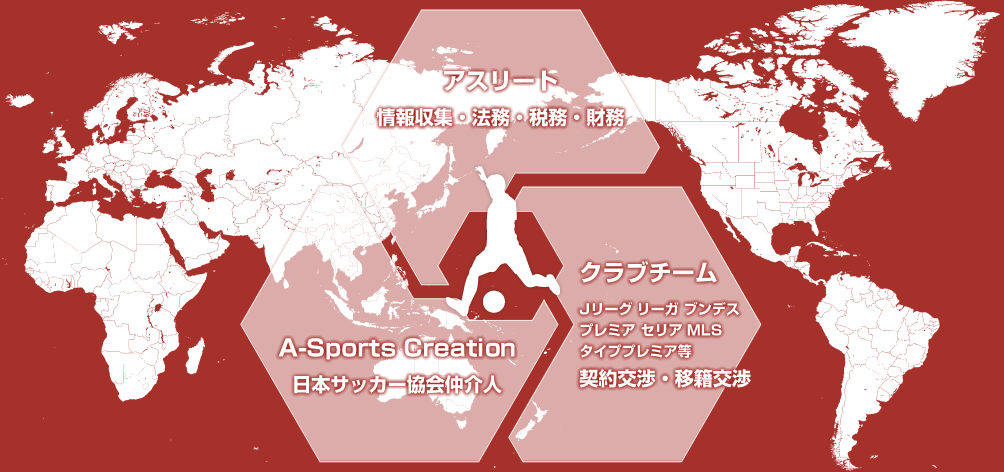 「アスリートとクラブが満足を得られるように、誠実に行動して、潤滑油となって、パートナーとして支えます。 エージェント(仲介人)は、日本サッカー協会から認定を受けて選手のエージェント(仲介人)として所属クラブとの様々な契約交渉を行うことが主な仕事です。